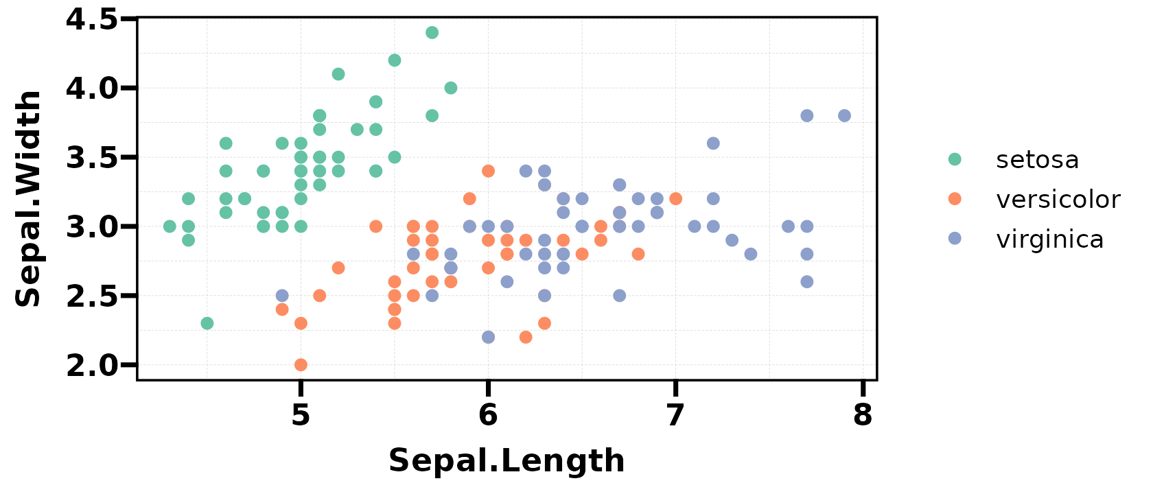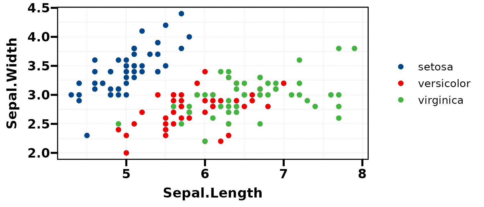 ggplot(iris, aes(Sepal.Length, Sepal.Width, color = Species)) +