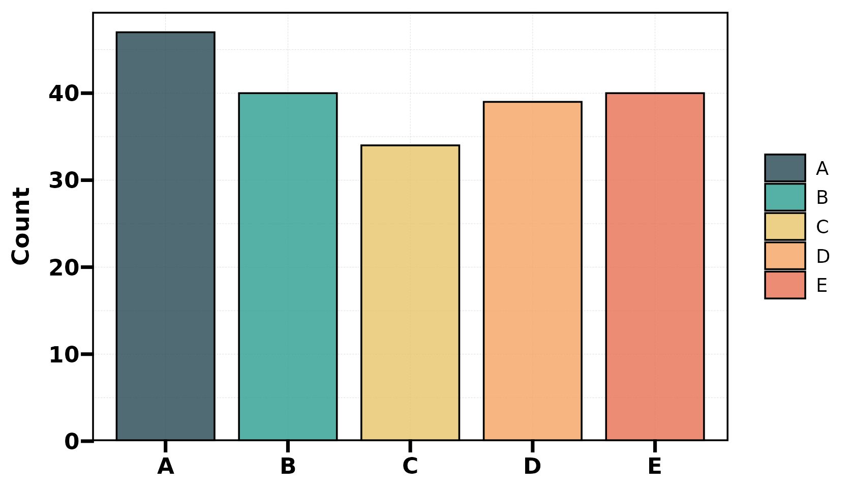 #> [1] "#264653" "#2A9D8F" "#E9C46A" "#F4A261" "#E76F51"Use with plt_cat()