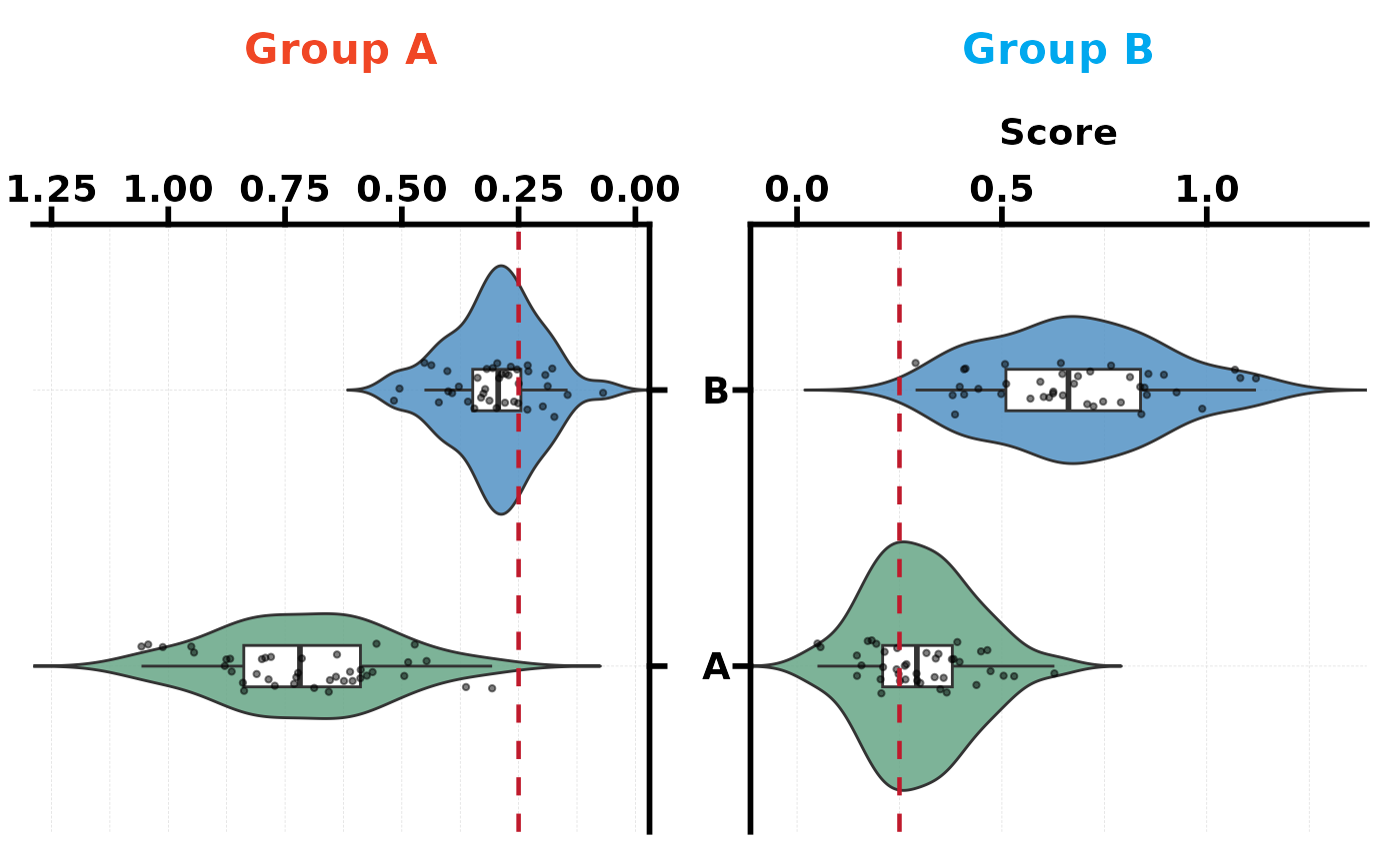 "bar": stacked horizontal bar chart (e.g. Risk vs Protective counts across two groups)."bar_dodge": side-by-side (dodged) horizontal bar chart. Eachfill.bylevel is drawn as a separate bar instead of stacked."violin": mirrored violin plots comparing continuous distributions between two conditions.