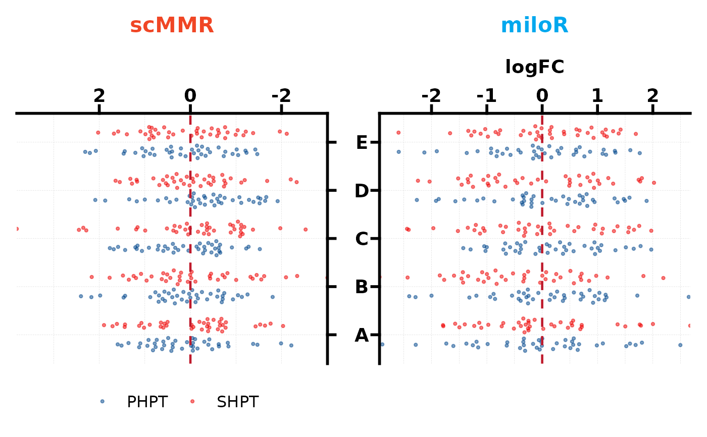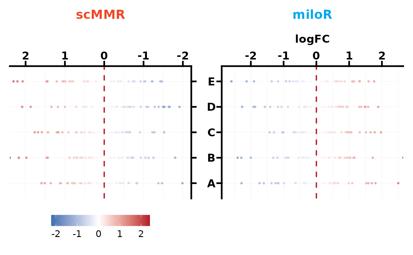 method = rep(rep(c("scMMR", "miloR"), each = 200), 2),
