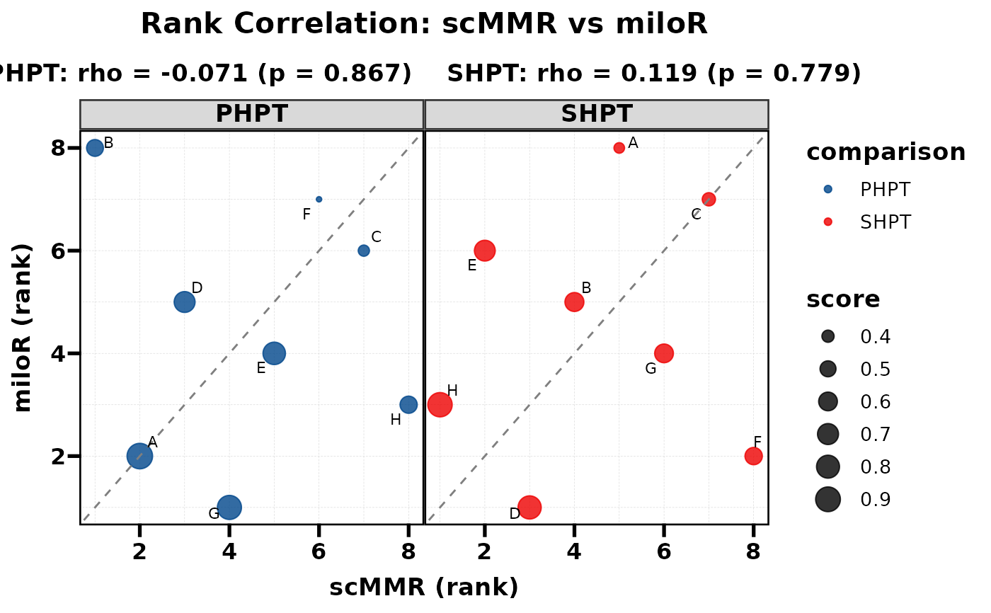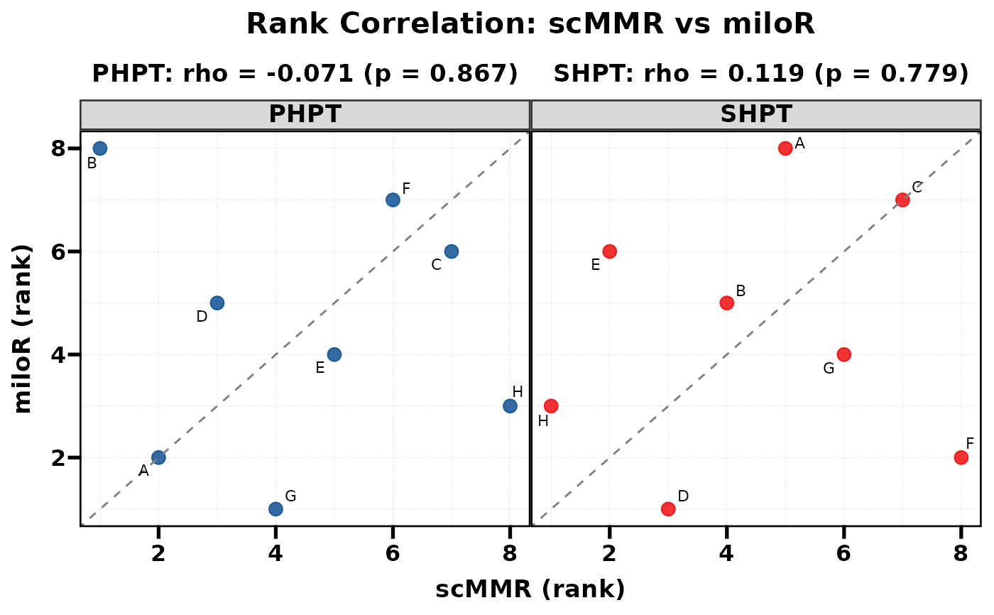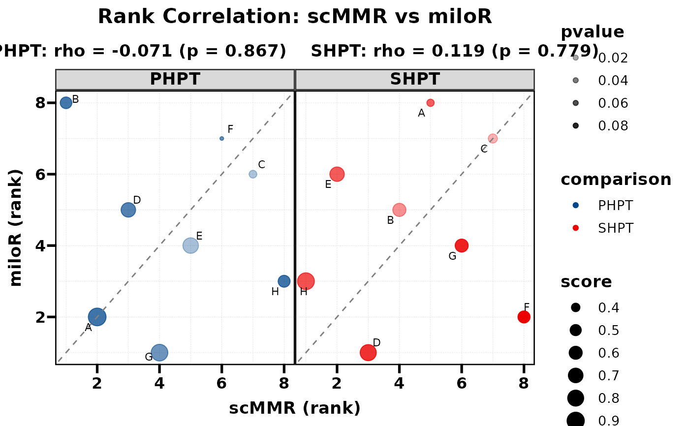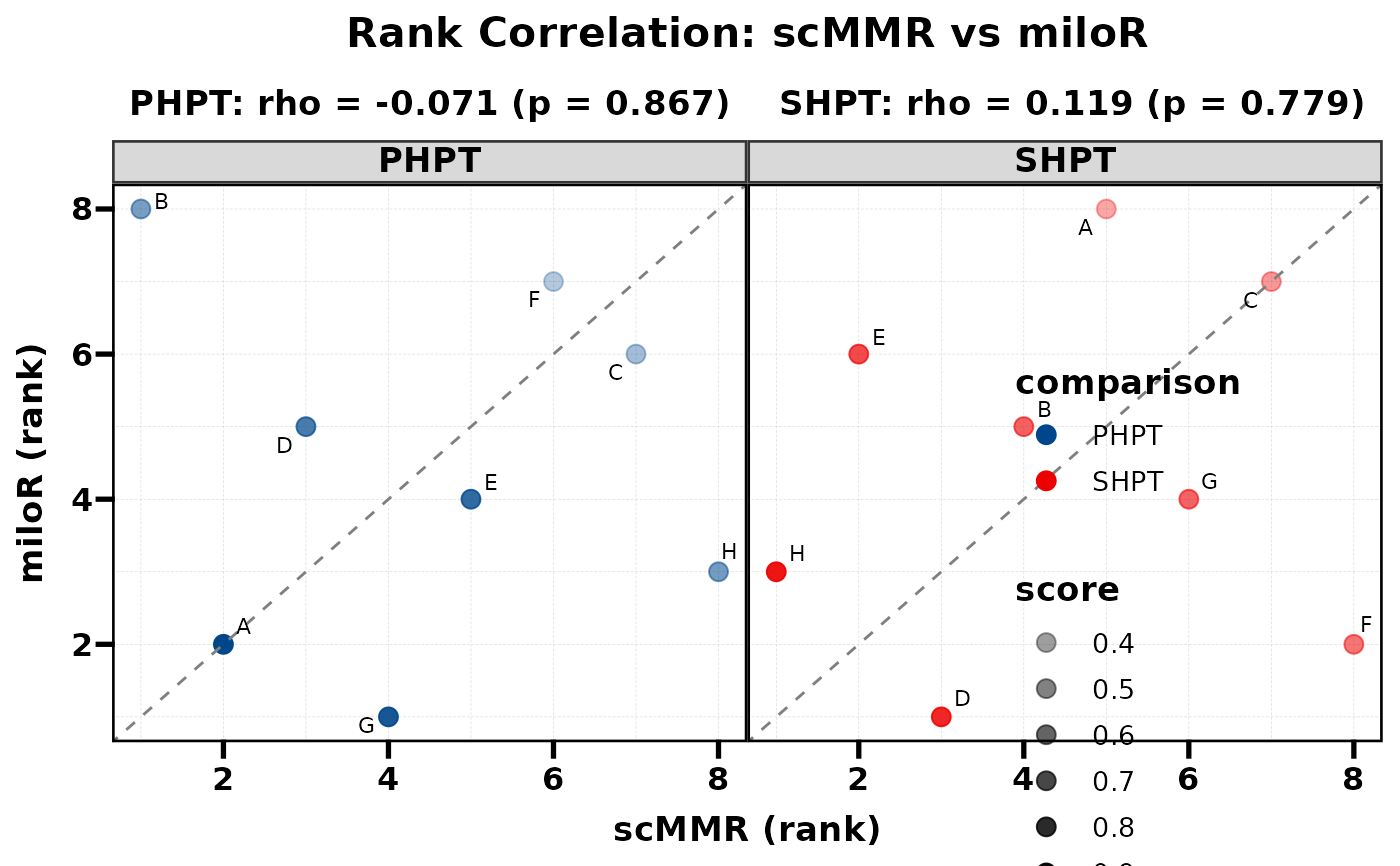 Compare two methods by plotting their ranks against each other. Spearman correlation and p-value are computed internally and displayed as subtitles. When multiple groups exist (e.g. PHPT vs SHPT), each group is shown as a separate facet with its own correlation statistics.