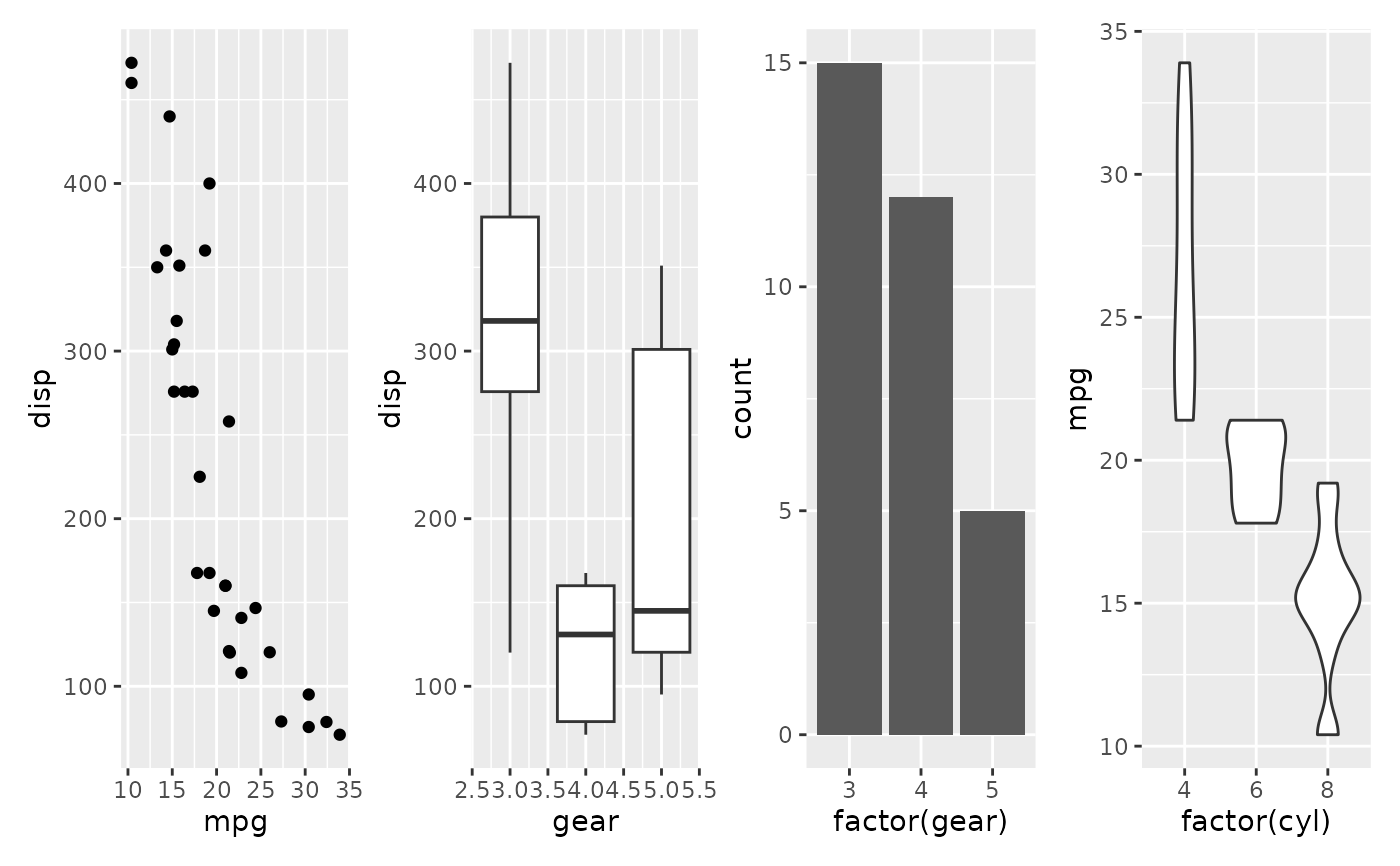 p4 <- ggplot(mtcars, aes(factor(cyl), mpg)) + geom_violin()