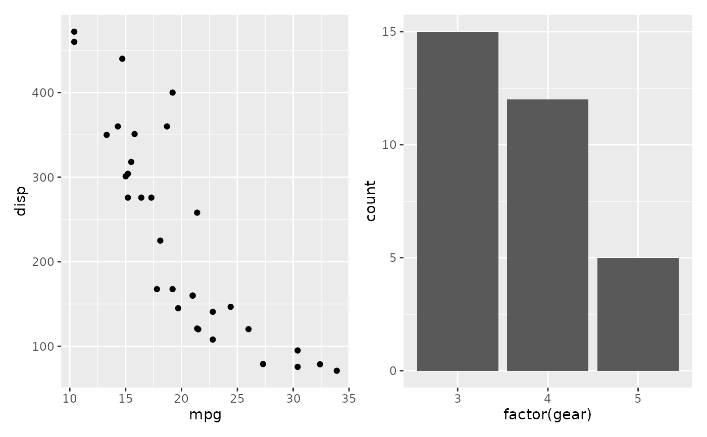 p1 <- ggplot(mtcars, aes(mpg, disp)) + geom_point()