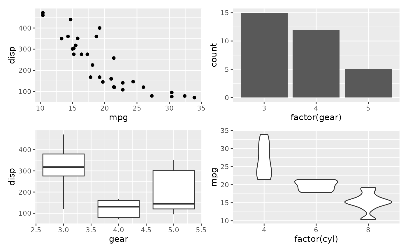 p2 <- ggplot(mtcars, aes(gear, disp, group = gear)) + geom_boxplot()