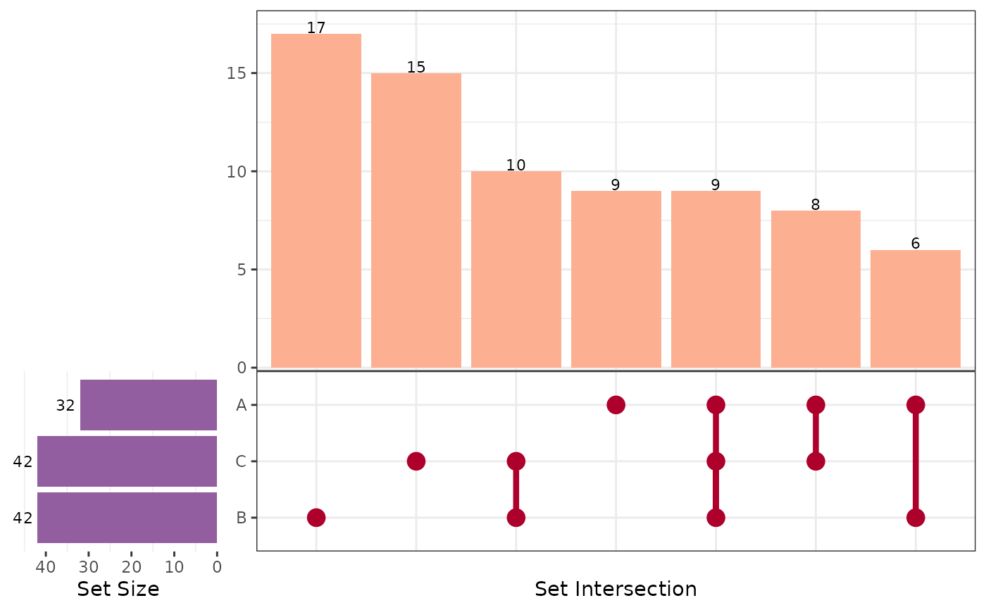 result <- plt_upset(df, vars = c("A","B","C"), output = "data")